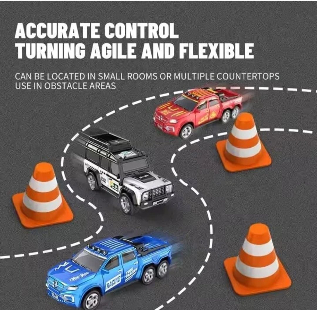 A mini off-road RC metal car is a small-scale, remote-controlled vehicle designed to drive on rough or uneven surfaces, like dirt, carpet, or small obstacles.